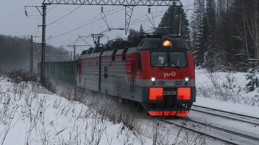 Встреча грузовых поездов под электровозами 2ЭС5К-410 и ВЛ80С-1092. Перегон Кожиль - Глазов Горьковской железной дороги. Январь 2020 года.