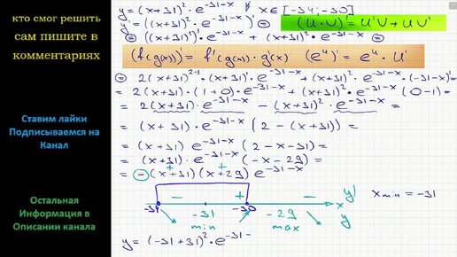 Математика Найдите наименьшее значение функции y = (x+31)^2 e^(-31-x) на отрезке [-34;-30].