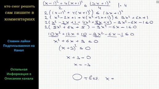 Математика Решите неравенство ((x-1)^2 + 4(x+1)^2)/2 ≤ ((3x+1)^2)/4