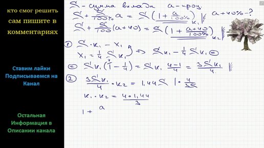Математика Банк под определенный процент принял некоторую сумму. Через год четверть накопленной суммы была снята со счета. Банк увеличил
