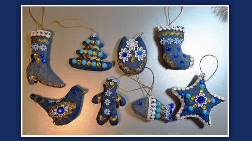 Разрезала старые джинсы и сделала из них игрушки на елку. Шью новогодние игрушки из джинсовой ткани, кружева и страз. Новогодний декор. DIY