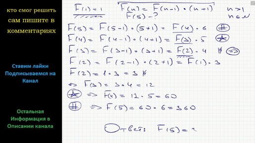 Математика Алгоритм вычисляющий функции F(n), где n - натуральное число, задан следующими соотношениями: F(1) = 1; F(n) = F(n-1)*(n+1) при