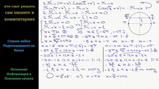 Математика а) Решите уравнение 2Sin(п+x) Cos(п/2+x) = Sinxб) Найдите все корни этого уравнения, принадлежащие отрезку [-5п;-4П]