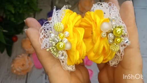 Рабочие моменты по созданию фантазийных цветов из атласной ленты