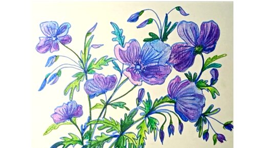 🌸Лиловые луговые цветы, нарисованные синим маркером и акварельными карандашами. 🌸