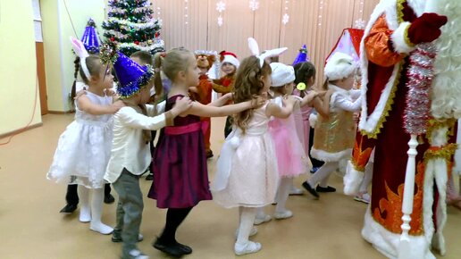 Дети играют в паровозик с Дедом Морозом