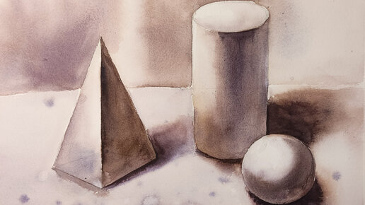 Геометрика в акварели. упражнение 4. Шар, цилиндр и пирамида.
