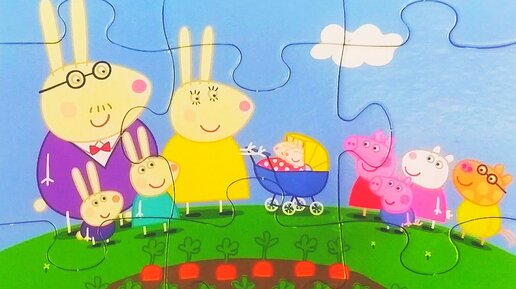 Свинка Пеппа и семья миссис Зайчихи у морковный грядок. Собираем детские пазлы со. Свинкой Пеппой