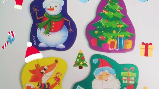 Новогодний пазл. Снеговик, Ёлочка, Лисичка, Дед Мороз. Собираем пазл для малышей.