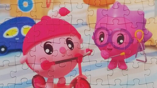 Нюша на самокате, а Барашек играет на треугольнике. Собираем пазл для детей Малышарики.