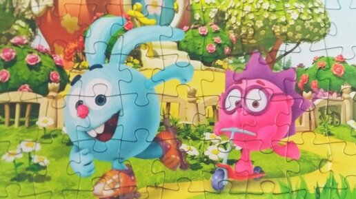Весёлая прогулка. Крош на роликах, а Ёжик на самокате . Собираем пазл для детей Смешарики.