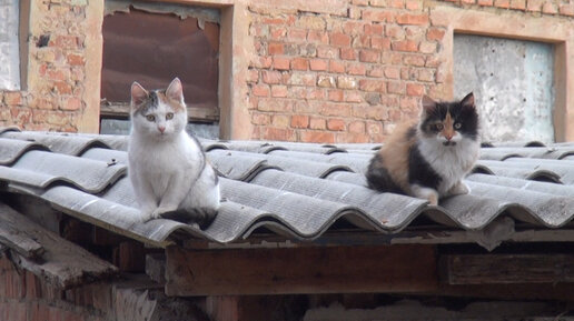 Котята на крыше и чёрный кот. Наглые вороны