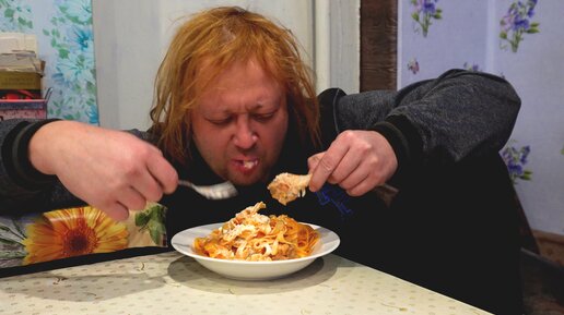 Деревенский мужик после домашних дел съел вечерний ужин с итальянской пастой российского производства ПОДВАЛ ИЛЬИЧА мукбанг, mukbang, еда