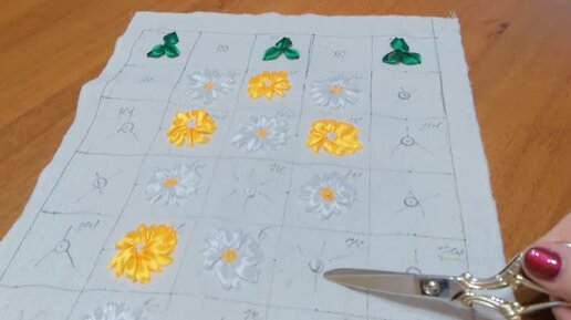 Вышивка лентами. Белые и желтые цветы с орнаментом из листьев и бордюром из узкой ленты