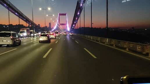 Проезд по мосту Султан Мехмет Фатих в Стамбуле с вечерней подсветкой - едем на высоте около 60 метров над Босфором