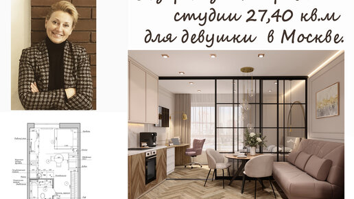 Обзор дизайн-проекта студии 27,40 кв.м для молодой девушки, в Москве. Кухня, спальня, санузел.