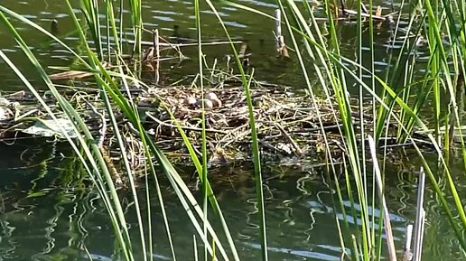 Чомга подплывает к гнезду и садится на яйца
