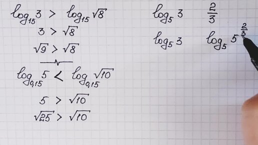 Рассматриваем принцип сравнения логарифмов между собой и сравнение логарифмов с дробными числами.