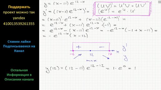 Математика Найдите наибольшее значение функции y=(x-11)e^(12-x) на отрезке [-6;17].