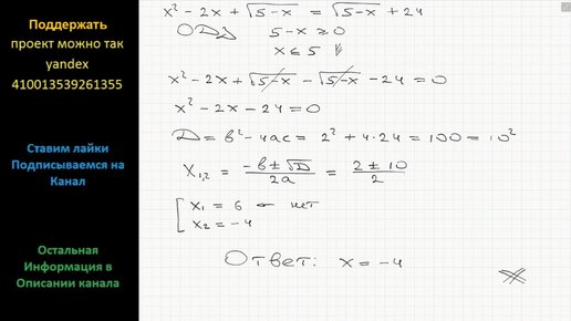 Математика Решите уравнение x^2 -2x +√(5-x) = √(5-x) +24