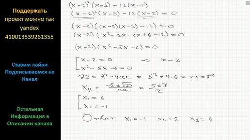 Математика Решите уравнение (x-2)^2 (x-3)=12(x-2)