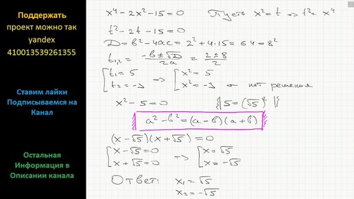 Математика Решите уравнение x^4 -2x^2 -15 =0