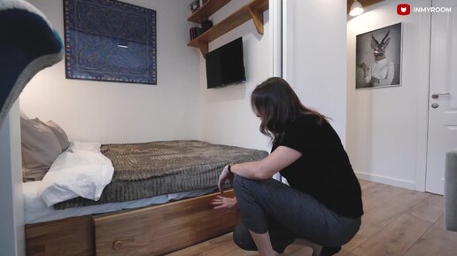 Уютная спальня в нише 3кв.м, где предусмотрели даже хранение для белья. Оцените идею в хрущевке!