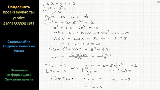 Математика Решите систему уравнений 5x+y=-13 x^2+y^2=13