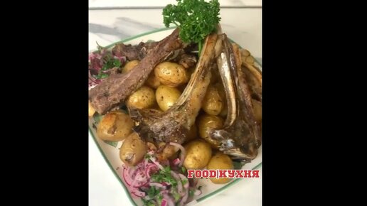 Баранина с запеченным картофелем Ингредиенты Каре ягненка Картофель бэби Перец соль Кориандр Паприка Розмарин Масло Киви Лук Накрываем фольгой и отправляем в духовку 220вначале на 30минут зачет у