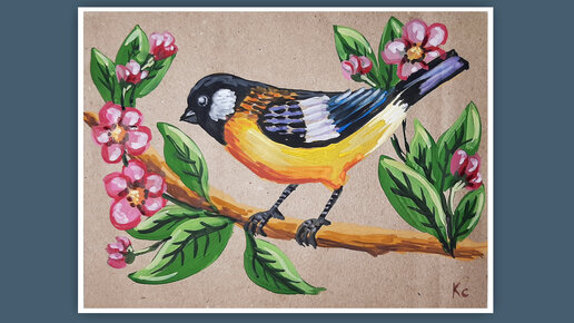 Рисуем синицу. Как нарисовать синицу просто. Рисуем птицу на цветущей ветке. Весенний рисунок на крафтовой бумаге. Простой рисунок для детей