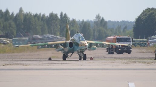 Руление и взлёт штурмовика Су-25УБ ВВС Туркменистана 53 синий.