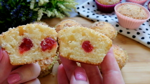 Как пух, пышные и нежные кексы с вишней и миндалем. Очень быстрый и вкусный десерт к чаю