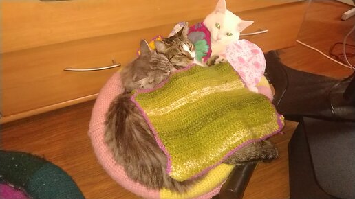 Дочь уложила трёх взрослых котов спать и читает им книгу
