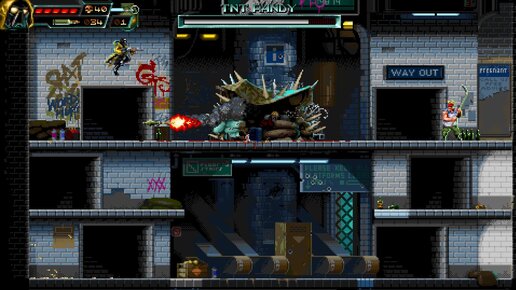 Huntdown - ретрошутер, сражение с хоккейным боссом