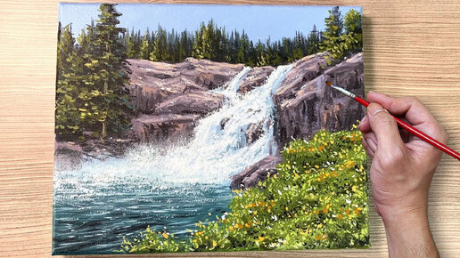 Рисуем Водопад переходящий в реку. Живопись акрилом. Картина на холсте