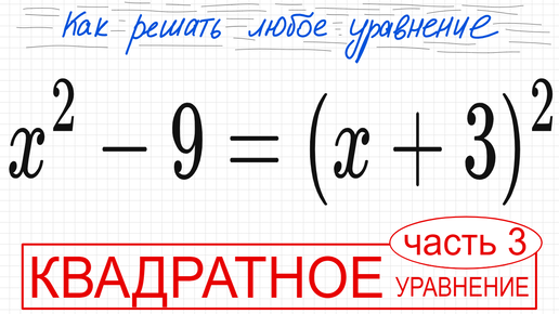 №3 Квадратное уравнение со скобками x^2-9=(х+3)^2 Как избавиться от скобок в уравнении Как решить уравнение 8кл 9кл ОГЭ 10кл 11кл ЕГЭ
