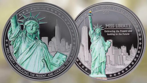 2 серебряные монеты 5 и 10 долларов с изображением Статуи Свободы.