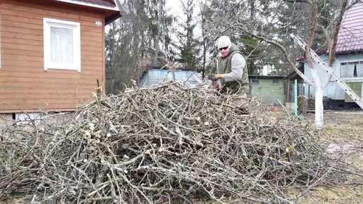 Распилка веток пилой, в целях уменьшения объёма веток, после обрезки яблонь.