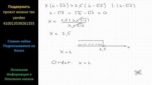 Математика Найдите наибольшее целое число, удовлетворяющее неравенству x(3-√10)>2,5(3-√10)