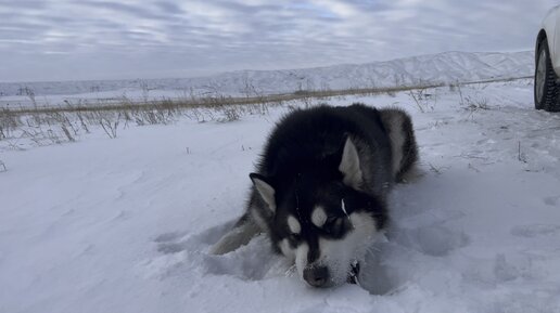 Очень выносливый пёс... Не хочет в машину, нужно бегать... Вот такой он после многокилометровой пробежки. Мало ему...#маламут #Брут #аляскинскиймаламут #собака #прогулкассобакой