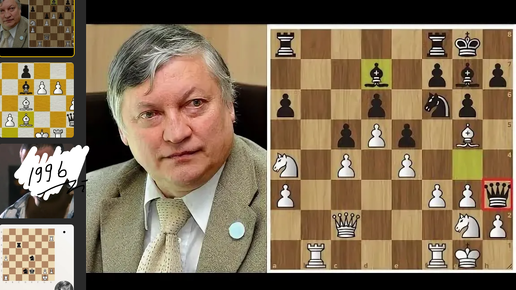 Анатолий Карпов играет белыми против Олега Романишина в шахматы: всего 33 хода понадобилось, чтобы забрать победу (Швейцария, 1996, 1-0)