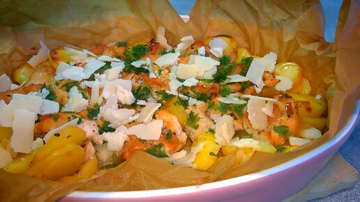 Картофель кусочками с куриным филе в соевом соусе с кунжутом