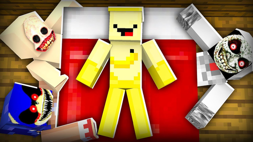 У МЕНЯ ПОД КРОВАТЬЮ скрываются Луна хулиган , Улыбающийся человек и Соник монстр в Майнкрафт