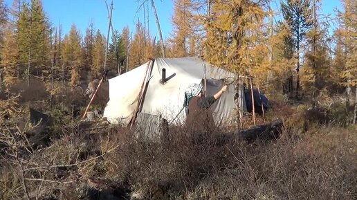 Как эвенки "моют" в палатке пол. Эвенкийское стойбище, лагерь оленеводов