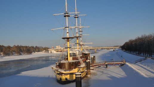 Вид с палубы ресторанного комплекса "Фрегат Флагман" на Новгородский Кремль и реку Волхов.