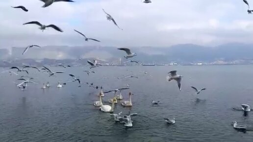 🦢Белые лебеди, чайки на Чёрном море в Новороссийске.