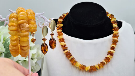 Двухрядный браслет, бусы и серьги из ЯНТАРЯ