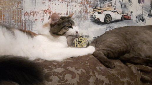 Кошка делает кусь за хвост кота!!! Что делает кот? Реакция?