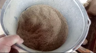 Просеивание корма кроликам с помощью сита.