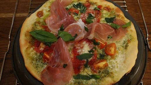 Хрустящая пицца с ветчиной, помидорами и перцем